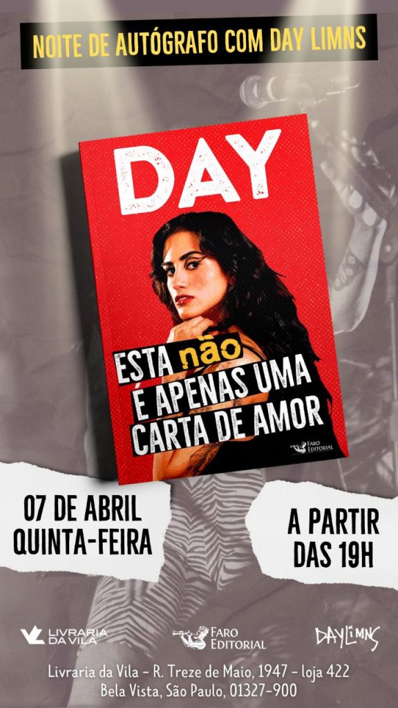 Sobre a sessão de autógrafo de “Esta Não É Apenas Uma Carta de Amor”, livro que estreou na 17ª posição dos mais vendidos da revista VEJA e foi inspirado em seu álbum de estreia, DAY se diz ansiosa para saber a opinião dos fãs. “Não posso estar mais feliz e realizada. Parece que estou vivendo em um sonho, sabe? Estou louco para saber a opinião dos fãs em relação ao livro. É algo que quero realmente sentir das pessoas”.