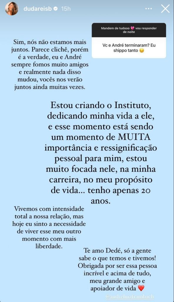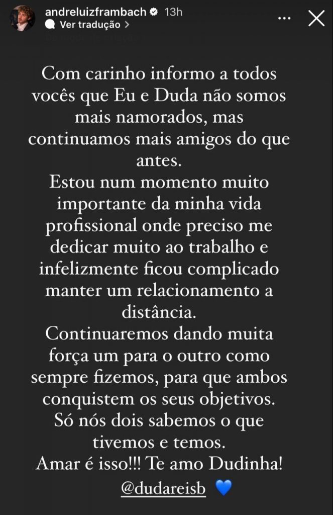 O ator também comentou sobre o fim do namoro em seu Instagram. “Com carinho informo a todos vocês que eu e a Duda não somos mais namorados, mas continuamos mais amigos do que antes. Estou num momento muito importante da minha vida profissional onde preciso me dedicar muito ao trabalho e infelizmente ficou complicado manter um relacionamento a distância. Continuaremos dando muita força um para o outro como sempre fizemos, para que ambos conquistem os seus objetivos. Só nós sabemos o que tivemos e temos. Amar é isso! Te amo Dudinha!”, escreveu.