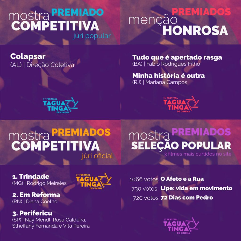 Grandes emoções, filmes plurais, diálogos emergentes, aplausos, comemorações, projeções e reconhecimento de corpos e narrativas periféricas invisibilizadas, enalteceram os festejos da noite de premiação desta 15ª edição do Festival Taguatinga de Cinema, marcada pela inovação de se construir e realizar uma programação inteiramente online para nosso público.Os 10 filmes selecionados receberão troféu do artista plástico de Taguatinga, Omar Franco, mais gratificação em dinheiro.