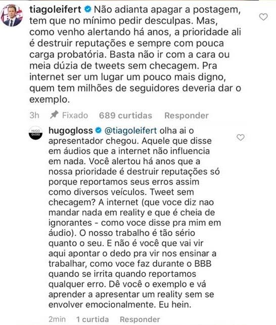 O apresentador do Big Brother Brasil, Tiago Leifert se desentendeu com o influencer Hugo Gloss por conta do reality da Record TV. Tiago fez uma crítica a uma postagem de Hugo no Instagram e os dois começaram a bater boca nas redes . eda coluna, esse é um contra-ataque de Tiago por não gostar das críticas feitas nas redes sociais de Hugo sobre o BBB.