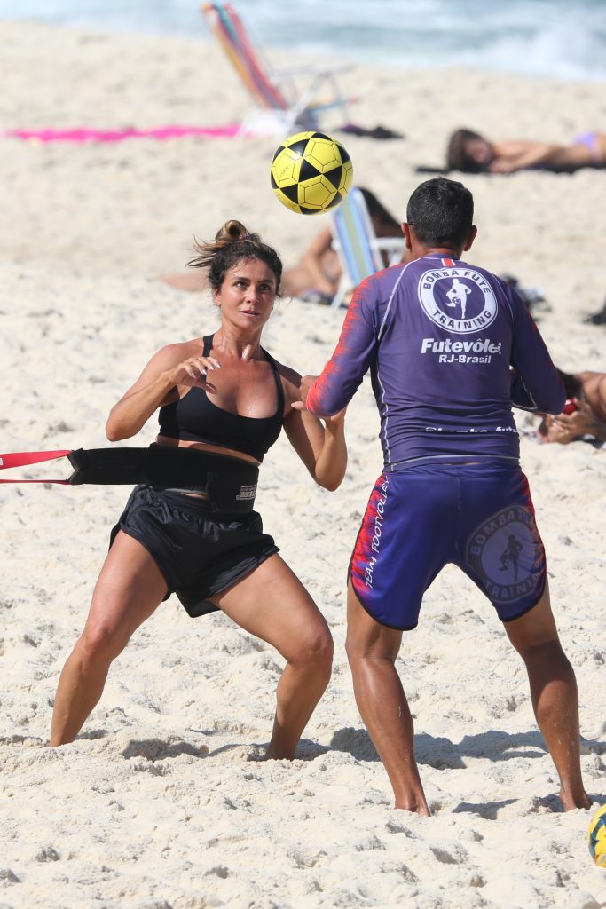 Na terça-feira (13), a atriz Giovanna Antonelli aproveitou o céu aberto do inverno carioca para treinar futevôlei na Praia da Barra da Tijuca, na Zona Oeste do Rio.