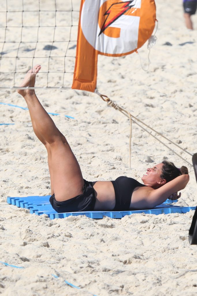 Vestida de short e top pretos, a atriz de 45 anos fez abdominais, flexões e exercícios com bola na areia. Sua expressão era de de muito esforço.