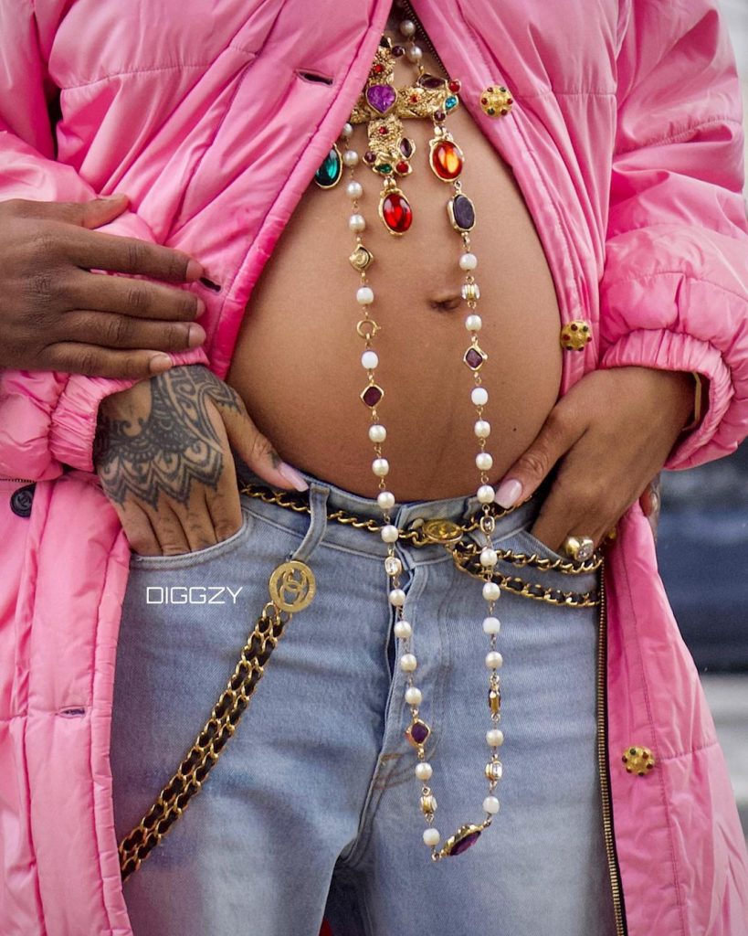 O casal foi fotografado em Nova York no fim de semana, onde Rihanna estreou seu novo “shape” enquanto usava uma longa jaqueta rosa aberta na barriga.