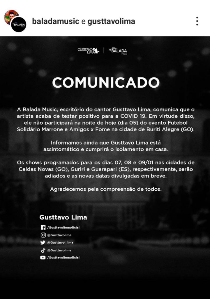 O cantor Gustavo lima cancelou a agenda de shows que teria esta semana por conta do resultado positivo para Covid-19. Em nota a assessoria confirmou pelo Instagram e comunicou que as datas a serem remarcadas serão as dos dias 7, 8 e 9 de janeiro que seriam realizados nas cidades de Caldas Novas (GO) Guriri e Guarapari (ES).
