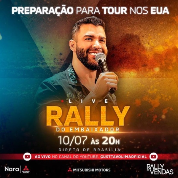 Contando os dias para sua turnê nos Estados Unidos, 6 a 15 de agosto, Gusttavo Lima vai presentear seus fãs com uma nova e inédita live diferente de todas as outras que já aconteceram: Rally do Embaixador, com carros rodando e fazendo manobras simultaneamente ao seu show. A live será em Brasília, neste sábado (10), a partir das 20h, transmitida pelo canal do YouTube do cantor, e contará com a banda completa do músico, além de participações especiais de Zé Vaqueiro e Hungria Hip Hop, sendo mediada pelo apresentador Luiz Bacci.