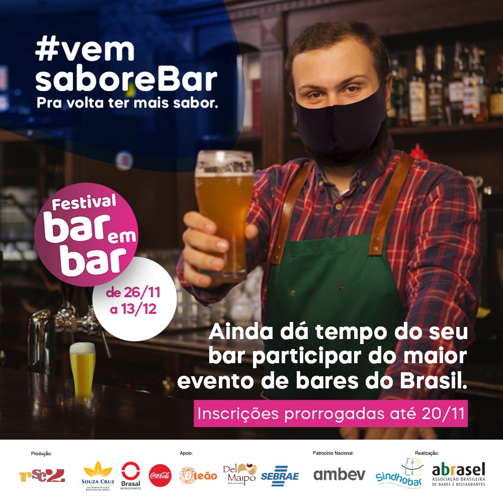 As inscrições para o Festival Bar em Bar foram prorrogadas até o dia 20 de novembro devido a pedidos de empresários do ramo. Podem participar tanto associados Abrasel e Sindhobar quanto não associados. Restaurantes que possuam serviço de Happy Hour também podem participar, desde que o petisco esteja no cardápio durante o Festival. O Bar em Bar acontece de 26 de novembro a 13 de dezembro, com petiscos especiais a preços promocionais (R$35). Os petiscos podem ser criados especialmente para o festival ou podem ser petiscos já existentes no cardápio. Esta edição tem um diferencial: as iguarias poderão ser pedidas in loco, via delivery ou via take away.