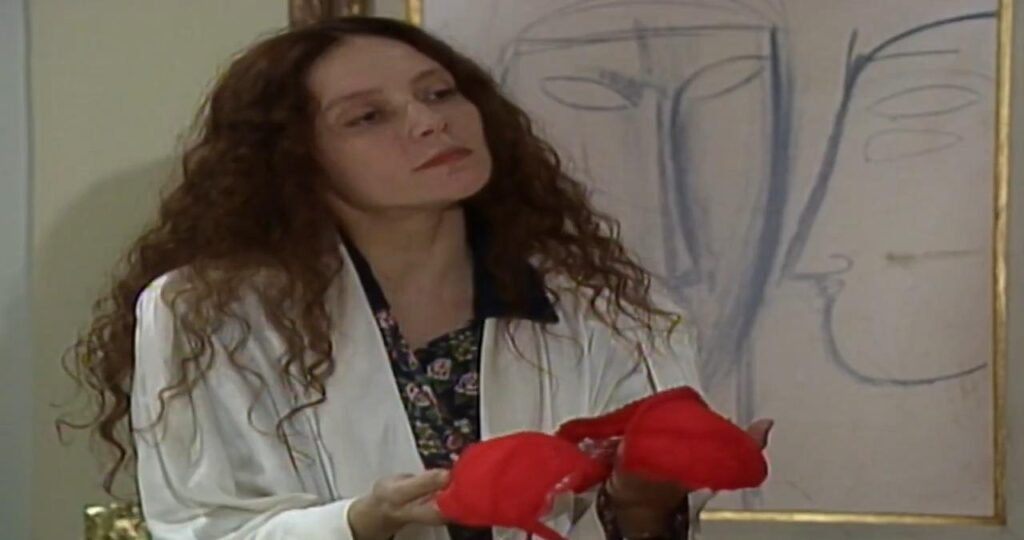 A bomba estoura quando a personagem encontra um sutiã dentro da jaqueta de Raul. A peça íntima, que pertence a Tainá, é o estopim para que ela perceba que sempre criticou os ciúmes de Diná com Téo, mas agora vive na pele o mesmo drama — só que com uma diferença: sua suspeita se confirma.