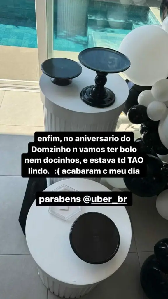 Então, o influenciador publicou cliques da mesa de doces vazia. “No aniversário do Domzinho não vamos ter bolo nem docinhos, estava tudo tão lindo. Acabaram com meu dia”, confessou. Uma hora depois, Lipe atualizou os fãs e mostrou que o bolo havia sido recuperado. Ele contou que o motorista cobrou R$ 80 para devolver o doce, e ainda o acusou de falsificar nome e foto no aplicativo de transporte.