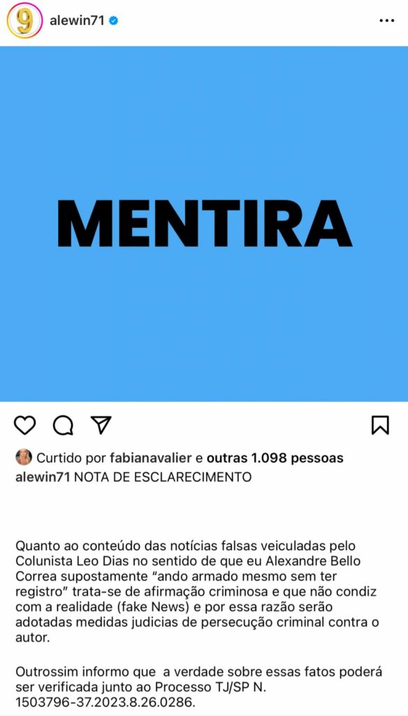 “Quanto ao conteúdo das notícias falsas veiculadas pelo Colunista Leo Dias no sentido de que eu Alexandre Bello Correa supostamente ‘ando armado mesmo sem ter registro’ trata-se de afirmação criminosa e que não condiz com a realidade (fake News)”, afirmou a nota publicada em seu perfil.