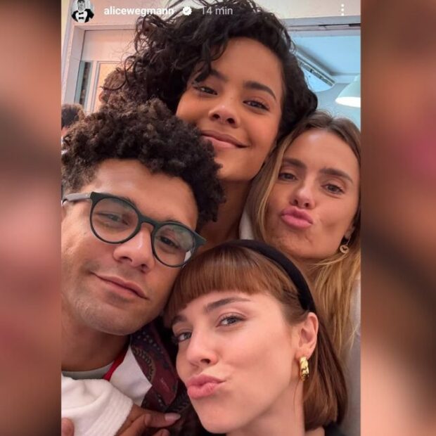 A intérprete de Solange Duprat compartilhou uma imagem nos stories ao lado de Carolina Dieckmann, Lucas Leto e Bella Campos. Na foto, Alice marcou os colegas e escreveu: “Delícia trabalhar com quem a gente gosta”.