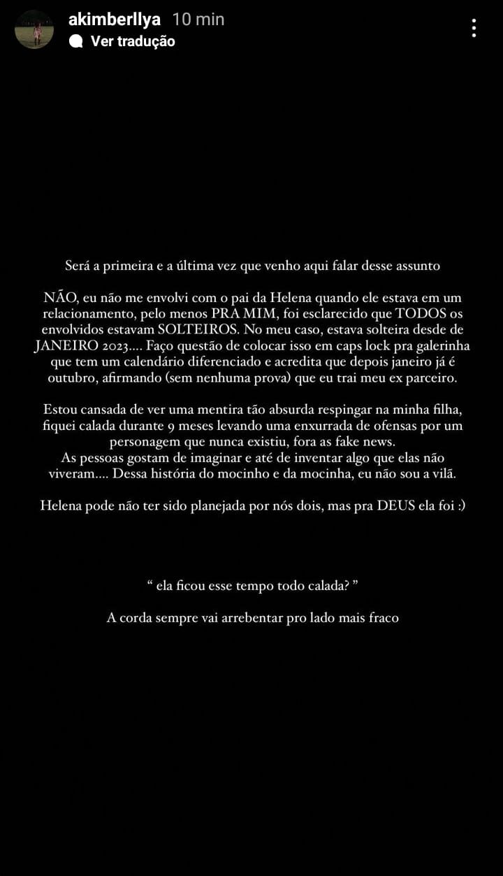 “E para os que têm um calendário diferente e acham que janeiro já é outubro, quero deixar bem claro que estava solteira desde JANEIRO de 2023! Estou cansada de ser acusada sem prova alguma de traição por um personagem que nunca existiu.”