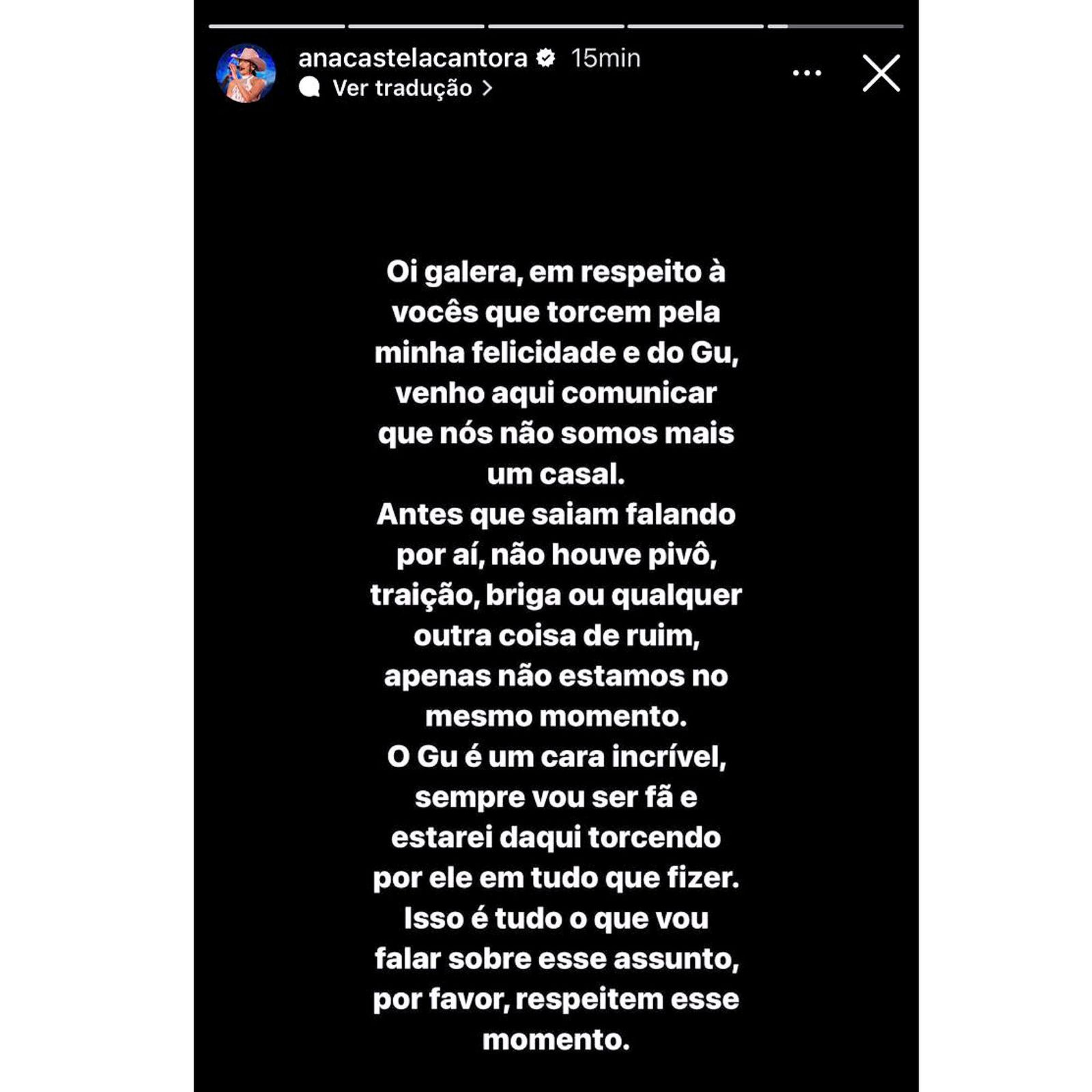 “Antes que saiam falando por aí, não houve pivô, traição, briga ou qualquer outra coisa de ruim, apenas não estamos no mesmo momento. O Gu é um cara incrível, sempre vou ser fã e estarei daqui torcendo por ele em tudo que fizer”, antecipou a cantora.