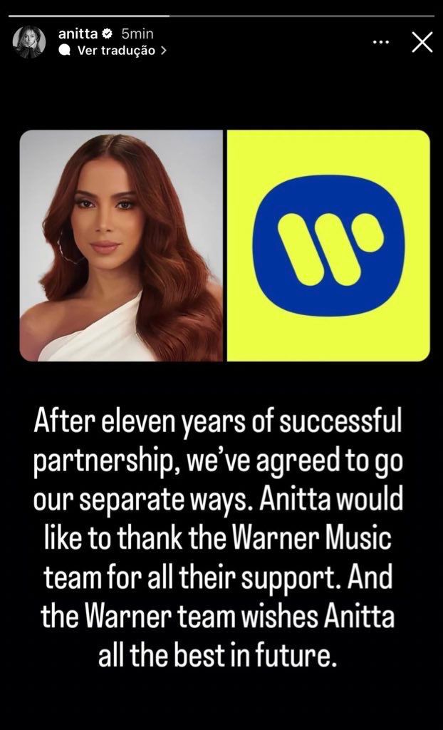 A novidade foi anunciada pela própria Anitta, que nos seus stories do instagram, fez a seguinte publicação: “Após onze anos de parceria bem-sucedida, concordamos em seguir nossos caminhos separados. Anitta gostaria de agradecer à equipe da Warner Music por todo o seu apoio. E a equipe da Warner deseja a Anitta tudo de bom no futuro”.