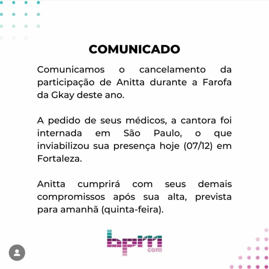 “Comunicamos o cancelamento da participação de Anitta durante a Farofa da Gkay deste ano. A pedido de seus médicos, a cantora foi internada em São Paulo, o que inviabilizou sua presença hoje (07/12) em Fortaleza. Anitta cumprirá com seus demais compromissos após sua alta, prevista para amanhã (quinta-feira)”, comunicou a empresa.