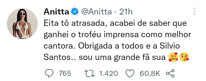 “Eita tô atrasada, acabei de saber que ganhei o troféu imprensa como melhor cantora. Obrigada a todos e a Silvio Santos… sou uma grande fã sua”