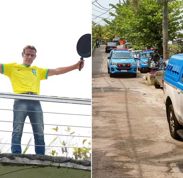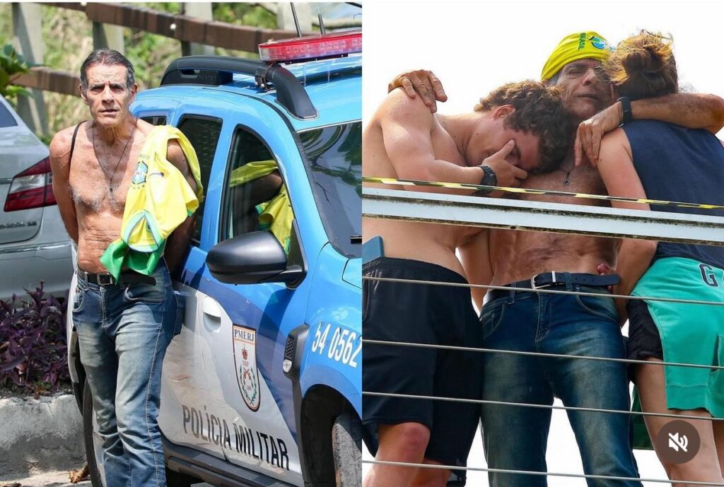 Da varanda da mansão, vestindo uma camisa do Brasil, o ex-galã da Globo bateu duas frigideiras enquanto os agentes estavam na porta da residência. O ator ainda chorou e posou para o fotógrafo que estava no local. Na entrada do imóvel, itens como colchões e móveis estavam jogados no chão. João Pallma, que é filho do ator, saiu com diversas mochilas.