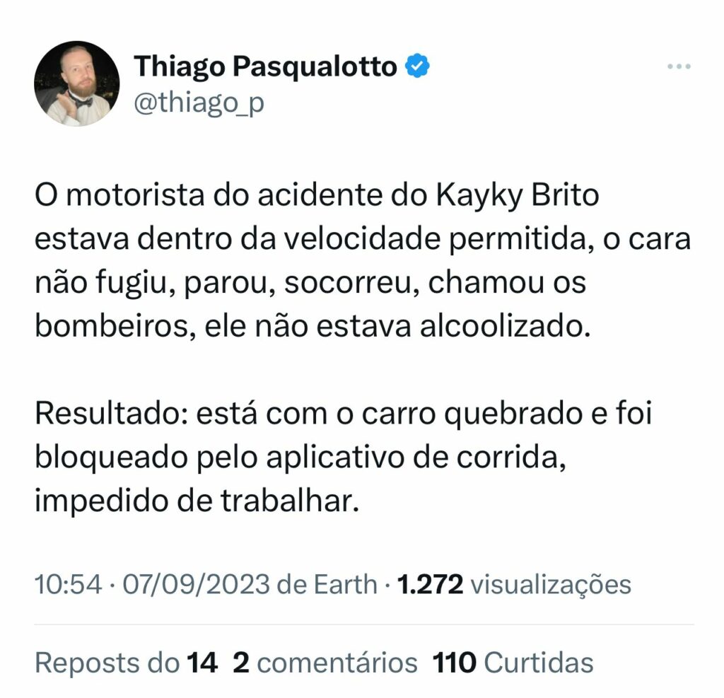 O motorista do acidente do Kayky Brito estava dentro da velocidade permitida, o cara não fugiu, parou, socorreu, chamou os bombeiros, ele não estava alcoolizado. Resultado: está com o carro quebrado e foi bloqueado pelo aplicativo de corrida, impedido de trabalhar.