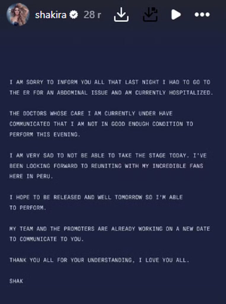 Em suas redes sociais, ela contou que foi hospitalizada por conta de um quadro de problema abdominal. Em sua agenda original da turnê, Shakira teria outro show marcado em Lima para esta segunda-feira (17). Até o momento, a cantora não cancelou e nem confirmou a apresentação.