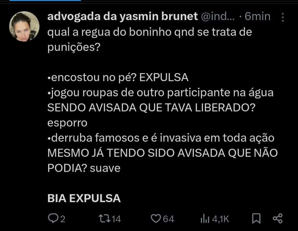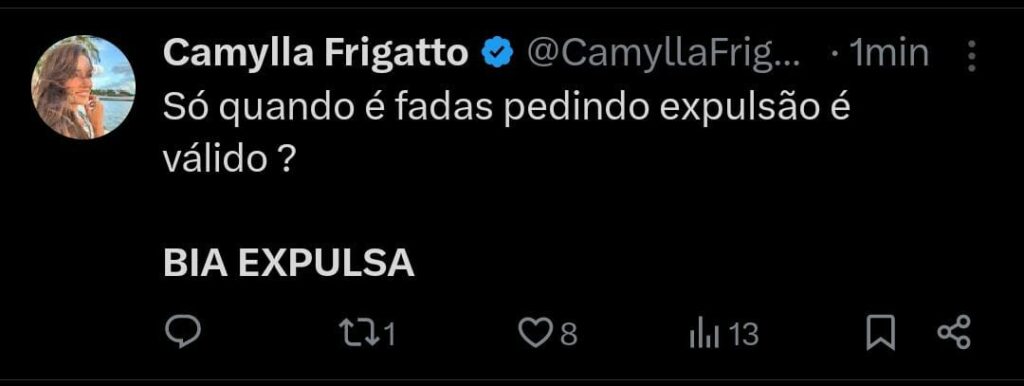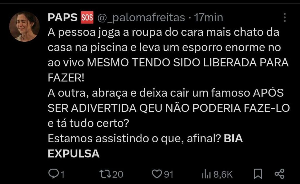 Diante desse ocorrido, muitos internautas estão pedindo a expulsão da participante, alegando que outros já foram expulsos do programa por muito menos. Confiram alguns dos comentários que estão rolando na Web, sobre o assunto.