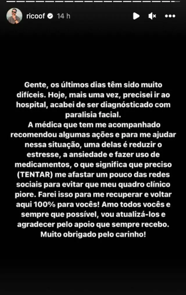 “Os últimos dias têm sido bem difíceis. Hoje, mais uma vez, precisei ir ao hospital, acabei de ser diagnosticado com paralisia facial. A médica que tem me acompanhado me recomendou algumas ações e, para me ajudar nessa situação, uma delas é reduzir o estresse, a ansiedade e fazer uso de medicamentos, o que significa que eu preciso (TENTAR) me afastar um pouco das redes sociais para evitar que meu quadro clínico piore”, disse ele.