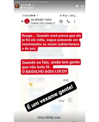Tudo começou quando Karin revelou a existência de um grupo no WhatsApp com todas as integrantes do extinto grupo pop dos anos 2000. No print, ela mostrou que Aline acabou saindo da “reunião virtual”, das cantoras após algumas conversas. E ela deixou claro que não curtiu nem um pouco essa atitude de Wirley.