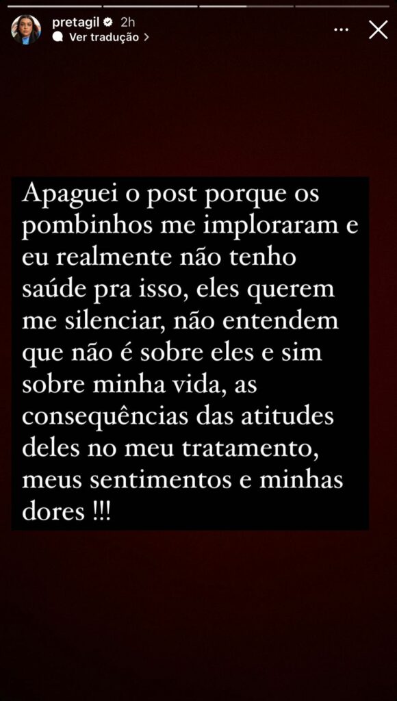 “Apaguei o post, porque os pombinhos me imploraram e eu realmente não tenho saúde para isso. Eles querem me silenciar, não entendem que não é sobre eles e, sim, sobre a minha vida. [Sobre] as consequências das atitudes deles no meu tratamento, meus sentimentos e minhas dores!”, escreveu.