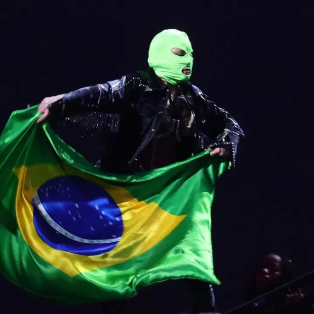 Porém, para se redimir com os brasileiros e não deixar aquele climão durante a sua apresentação na noite deste sábado (04), na praia de Copacabana, durante o seu ensaio de ontem (03), no mega palco que foi montado para receber a cantora, Madonna surgiu enrolada em uma bandeira do Brasil e utilizando uma camiseta verde e amarela.