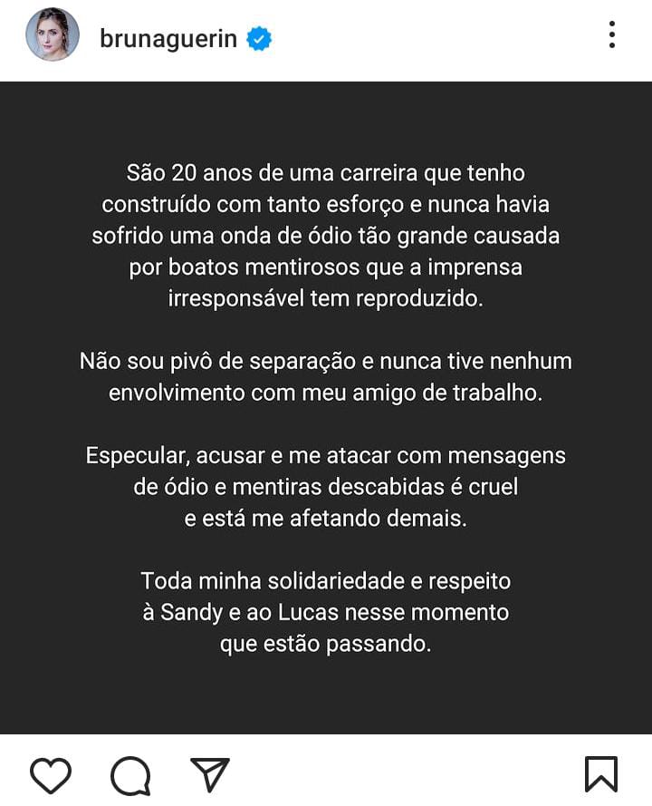 Minha gente, na manhã desta quarta-feira (27), contei para vocês que a atriz Bruna Guerin estava sendo apontada por algumas pessoas como o pivô da separação do casal Sandy e Lucas Lima, porém, com toda a repercussão que isso teve, a atriz, através do seu instagram publicou um pronunciamento sobre o assunto.