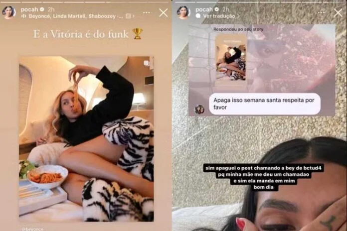 “Sim, apaguei o post chamando a Bey ‘b*cetuda’ porque a minha mãe me deu um chamadão. Sim, ela manda em mim”, declarou a jovem nos stories. O elogio foi devido a Beyoncé usar em seu novo álbum um sample de Aquecimento das Danadas, fruto da conexão do DJ O Mandrake com a equipe Furacão 2000. “E a vitória é do funk”, disparou Pocah.