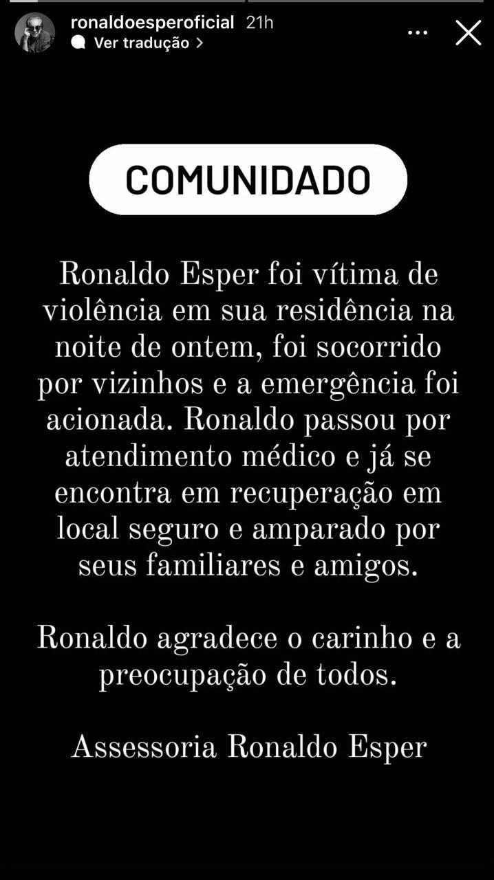 “Ronaldo Esper foi vítima de violência em sua residência, na noite de ontem. Foi socorrido por vizinhos e a emergência foi acionada. Ronaldo passou por atendimento médico e já se encontra em recuperação, em local seguro e amparado por seus familiares e amigos. Ronaldo agradece o carinho e preocupação de todos”, completaram.