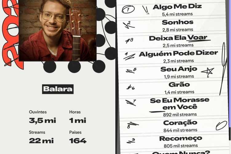 O Spotify Wrapped 2025 coroou um ano de expansão para BALARA, que acumulou 3,5 milhões de ouvintes, ultrapassou 22 milhões de streams e alcançou fãs em 164 países. O resultado expressivo consolida o artista como um dos nomes mais consistentes da nova cena da MPB, mantendo sua base fiel enquanto amplia horizontes e conexões mundo afora. Com mais de 1 milhão de horas escutadas, BALARA reafirma seu lugar no streaming com um repertório que equilibra sensibilidade, poesia e melodias marcantes. E tem mais novidade vindo aí: