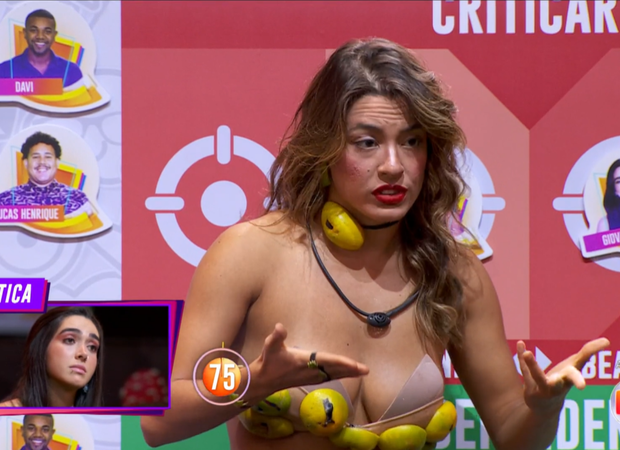 Bia ainda disse que Giovanna repete a opinião dos outros: “Então, pra mim, você não tem posicionamento firme da sua posição. Repete diálogos todo mundo. ‘Ah, que Davi manipula’. ‘Ah, que o seu jeito incomoda’. Esse é o meu jeito, a minha alegria. Não incomoda ninguém. Não passo por cima de ninguém. E não vou deixar de ser quem eu sou pra você se sentir confortável. Aqui não é um jogo confortável. Eu sou o que eu sou, incomodou, o problema é seu. E eu acho você sim uma planta que gnomo rega”, concluiu.