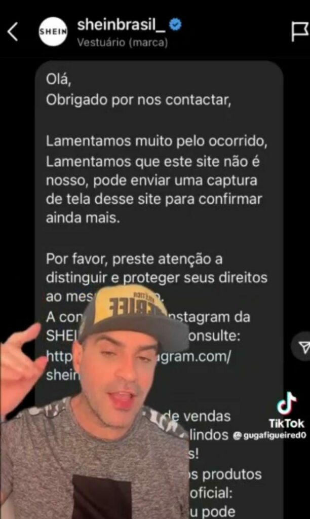 “A Shein já me respondeu que isso é golpe e nem adianta os influencer virem falar que não sabiam que era golpe e que estavam apenas fazendo publi, sabe porque? Porque eles simulam que estão sacando dinheiro dentro da plataforma, em uma página falsa, para enganar vocês e fazer vocês comprarem o aplicativo. O aplicativo custa R$97,00 e os influencer ganham comissão por cima do golpe”, garante Guga