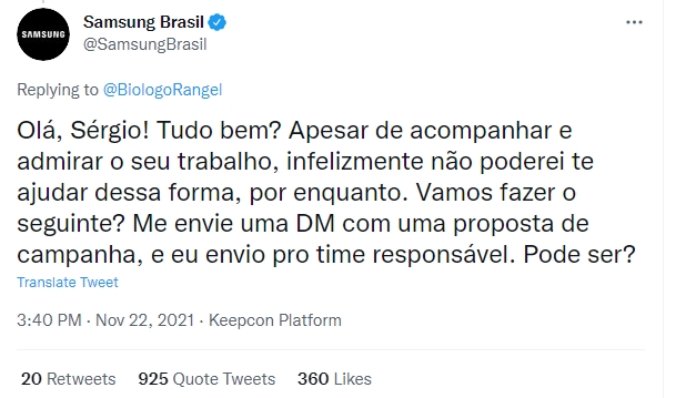 Com a mobilização dos seguidores e usuários do Twitter, o pedido de celular chegou até a Samsung, que respondeu o biólogo dizendo: “Olá Sérgio! Tudo bem? Apesar de acompanhar e admirar o seu trabalho, infelizmente não poderei te ajudar dessa forma, por enquanto. Vamos fazer o seguinte? Me envie uma DM com uma proposta de campanha, e eu envio pro time responsável. Pode ser?”