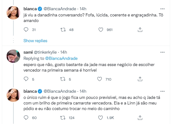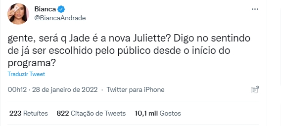Em papo com seus seguidores, no Twitter, Bianca perguntou se Jade seria a nova Juliette, que ganhou a simpatia do público e já estaria cotada para ser a vencedora desta edição do reality show. Uma seguidora respondeu: “Espero que não, gosto bastante da Jade, mas esse negócio de escolher vencedor na primeira semana é horrível!”