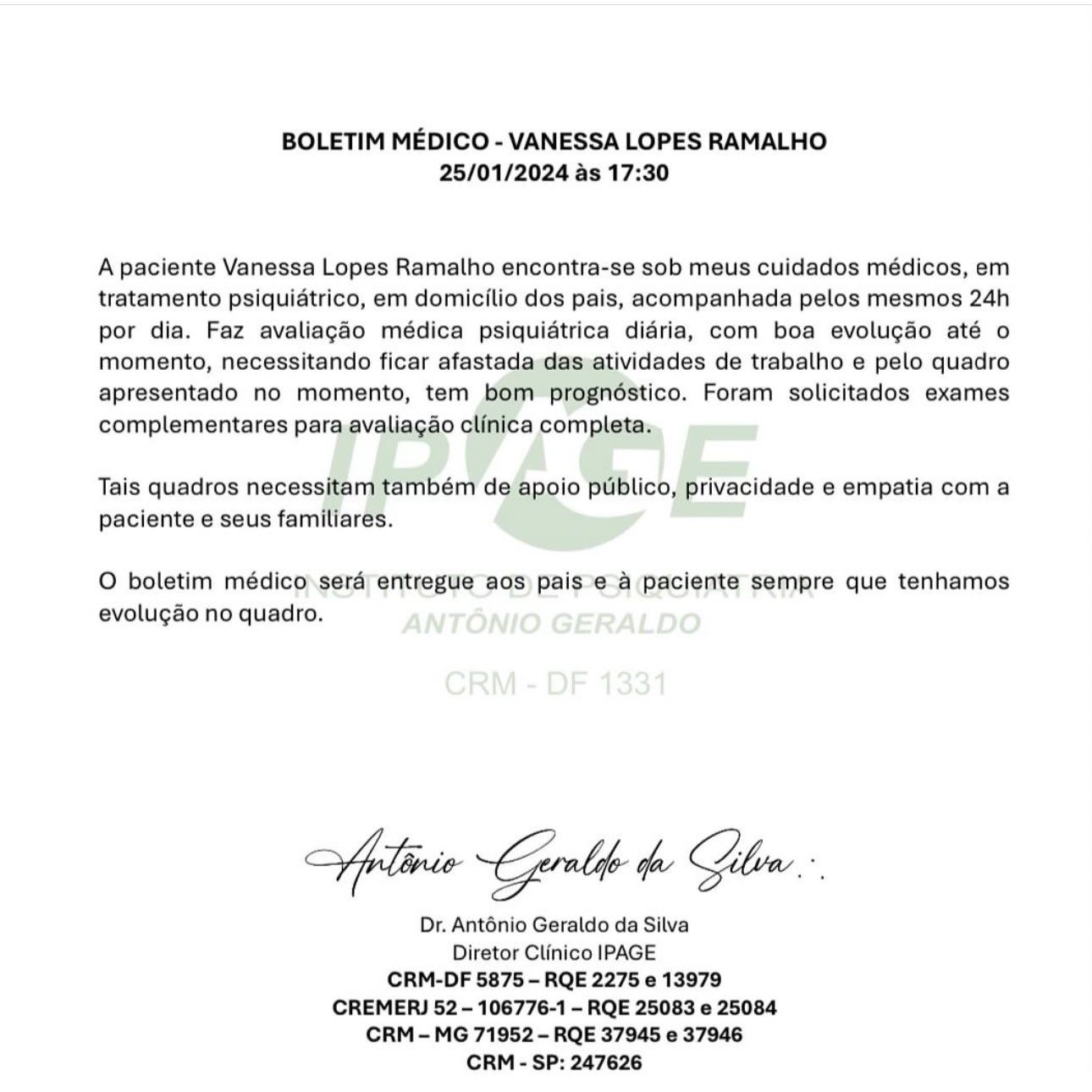 O comunicado, que é assinado pelo Dr. Antônio Geraldo da Silva, diretor clínico de um instituto psiquiátrico, revela que Vanessa está fazendo avaliações médicas diárias e está sendo monitorada 24h por dia por seus pais.