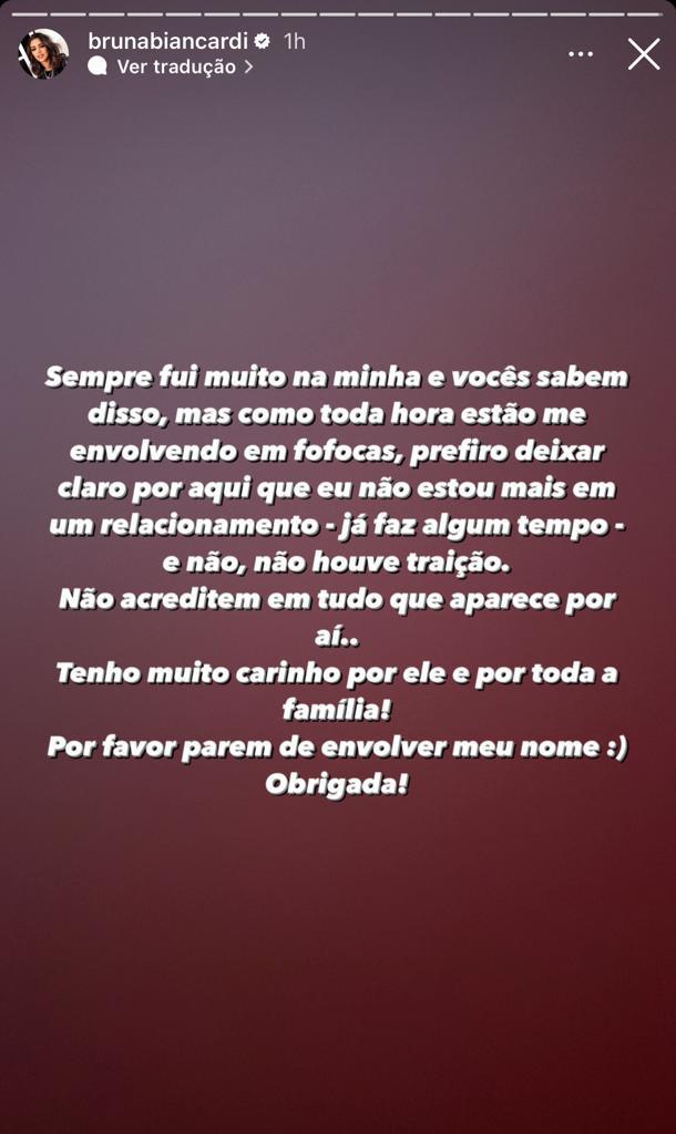 “Sempre fui muito na minha e vocês sabem disso, mas como toda hora estão me envolvendo em fofocas, prefiro deixar claro por aqui que não estou mais em um relacionamento.” Começou Bruna em um texto publicado em seus stories no Instagram.