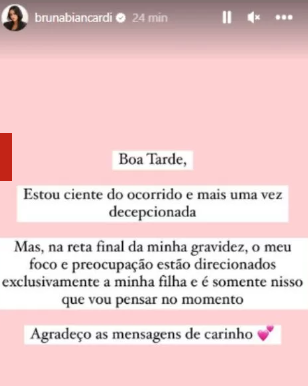 “Boa Tarde, estou ciente do ocorrido e mais uma vez decepcionada. Mas, na reta final da minha gravidez, o meu foco e preocupação estão direcionados exclusivamente à minha filha e é somente nisso que vou pensar no momento. Agradeço as mensagens de carinho”, publicou Biancardi.