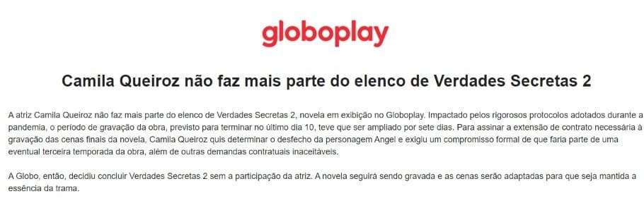 A Globo se pronunciou para a imprensa e o público. O email diz o seguinte: “A atriz Camila Queiroz não faz mais parte do elenco de Verdades Secretas 2, novela em exibição no Globoplay. Impactado pelos rigorosos protocolos adotados durante a pandemia, o período de gravação da obra, previsto para terminar no último dia 10, teve que ser ampliado por sete dias. Para assinar a extensão de contrato necessária à gravação das cenas finais da novela, Camila Queiroz quis determinar o desfecho da personagem Angel e exigiu um compromisso formal de que faria parte de uma eventual terceira temporada da obra, além de outras demandas contratuais inaceitáveis.