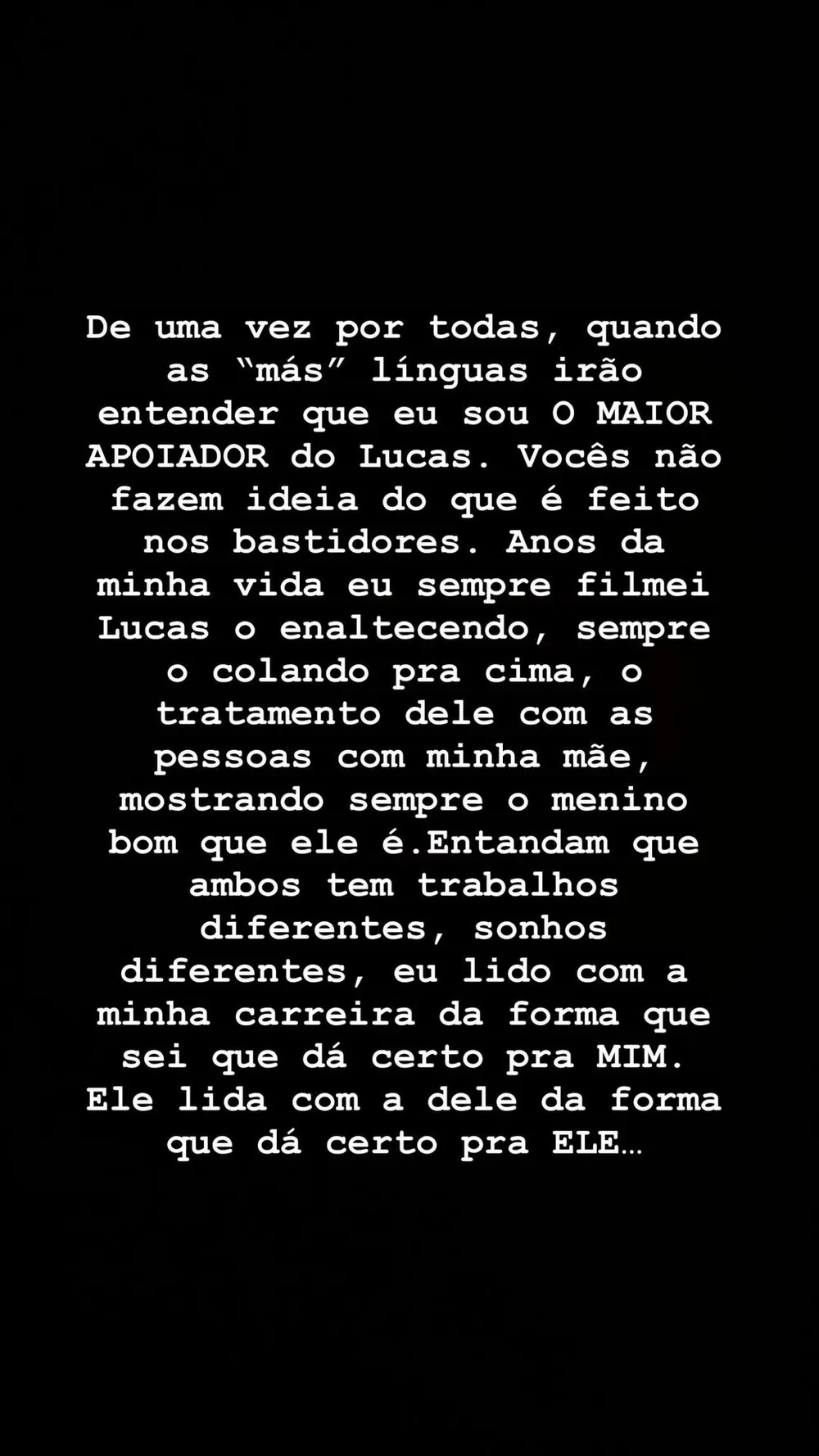“De uma vez por todas, quando as “más” línguas irão entender que eu sou o maior apoiador do Lucas. Vocês não fazem ideia do que é feito nos bastidores. Anos da minha vida eu sempre filmei Lucas o enaltecendo, sempre o colocando pra cima, o tratamento dele com as pessoas com minha mãe, mostrando sempre o menino bom que ele é”, Iniciou Carlinhos.