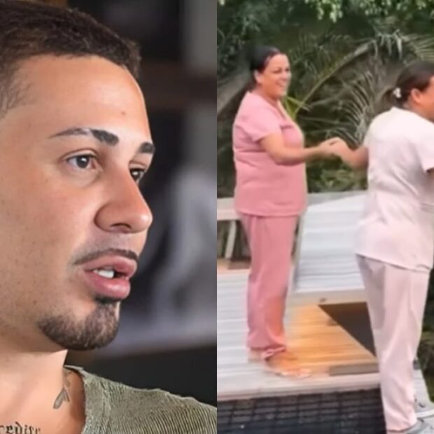 No vídeo, vemos que, enquanto uma delas limpa o coqueiro, a outra funcionária segura nas mãos da colega de trabalho para ter apoio no momento da limpeza. Mas parece que o influenciador não tem nada demais, até porque ele fez questão de postar isso nos seus stories.
