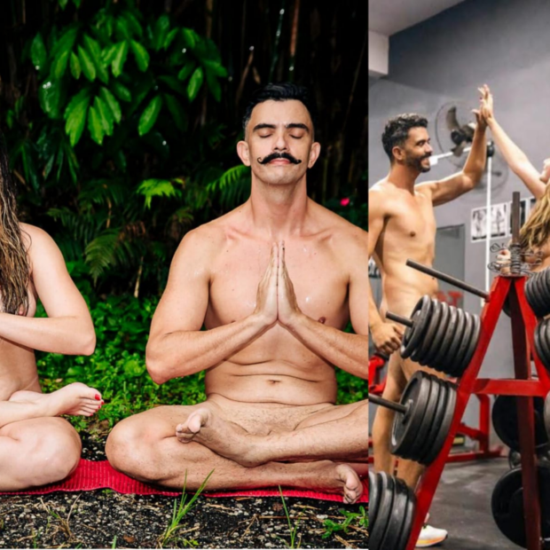 Bella Mantovani e Vagner, conhecidos como o ‘Casal Peladão’, viralizaram ao fazer exercícios na academia sem roupas e desde então estão levando sua ousadia para novos horizontes como a prática do Naked Yoga ao ar livre. Trocar as paredes da academia pelo ambiente natural foi uma decisão marcante para os dois: “Lá, enfrentávamos muito preconceito por treinar pelados.
