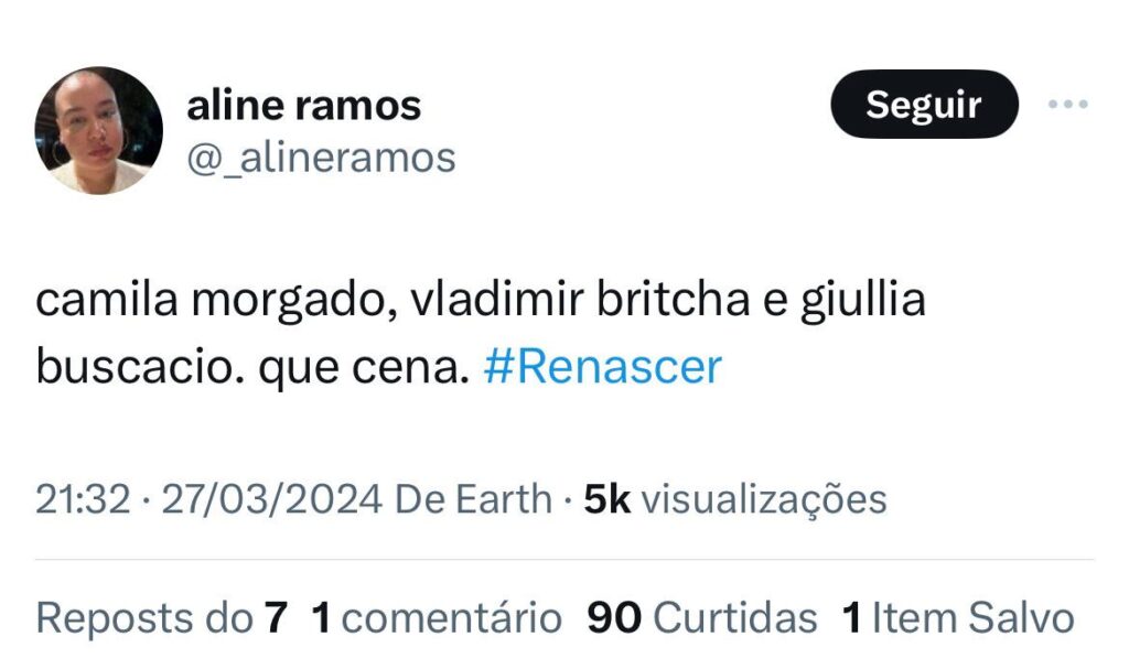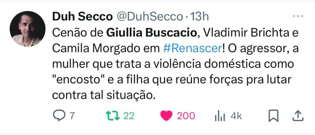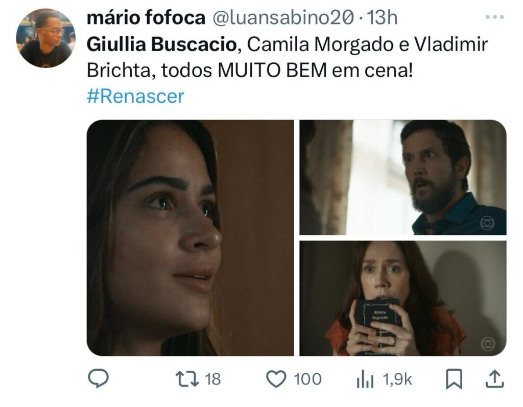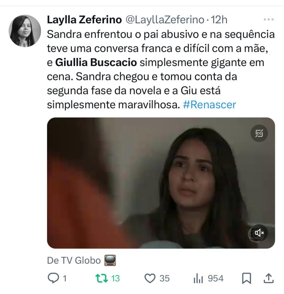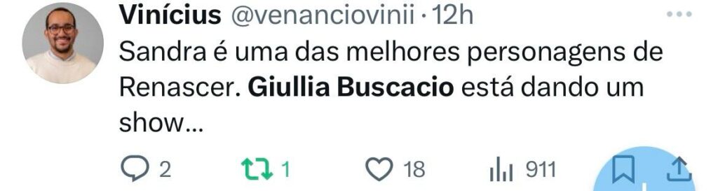 No X (antigo twitter), internautas elogiaram a personagem. “Giullia Buscacio, A DONA da segunda fase de Renascer. Sandra, a melhor personagem e a atriz dando show”, escreveu um. “Giullia Buscacio, Camila Morgado e Vladimir Brichta. Todos muito bem em cena”, disse outro. “Irretocável. Giullia Buscacio dominando o capítulo de hoje e brilhando nas sequências com Vladimir Brichta e Camila Morgado”, completa mais um.