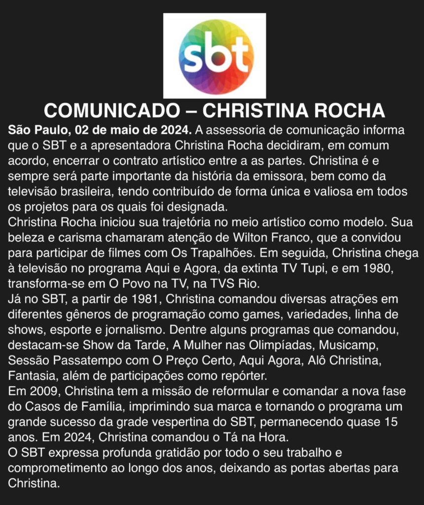 “A assessoria de comunicação informa que o SBT e a apresentadora Christina Rocha decidiram, em comum acordo, encerrar o contrato artístico entre a as partes”, diz o comunicado do SBT.