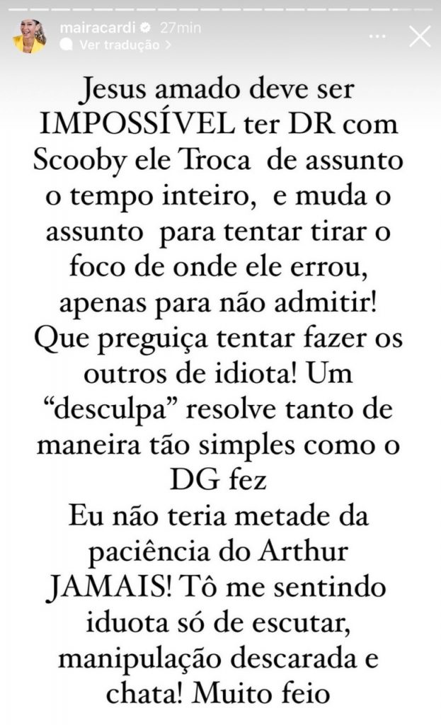 Maira Cardi, que não fica quieta por nada nesse mundo, postou um stories com os seguintes dizeres: “Jesus amado, deve ser impossível ter DR com Scooby. Ele troca de assunto o tempo inteiro, muda o assunto para tentar tirar o foco de onde ele errou apenas para não admitir! Que preguiça tentar fazer os outros de idiota! Um ‘desculpa’ resolve tanto de maneira tão simples como o DG fez. Eu não teria metade da paciência do Arthur jamais! Tô me sentindo idiota só de escutar, manipulação descarada e chata! Muito feio”. Manipulação? Scooby? Hmmmmm…
