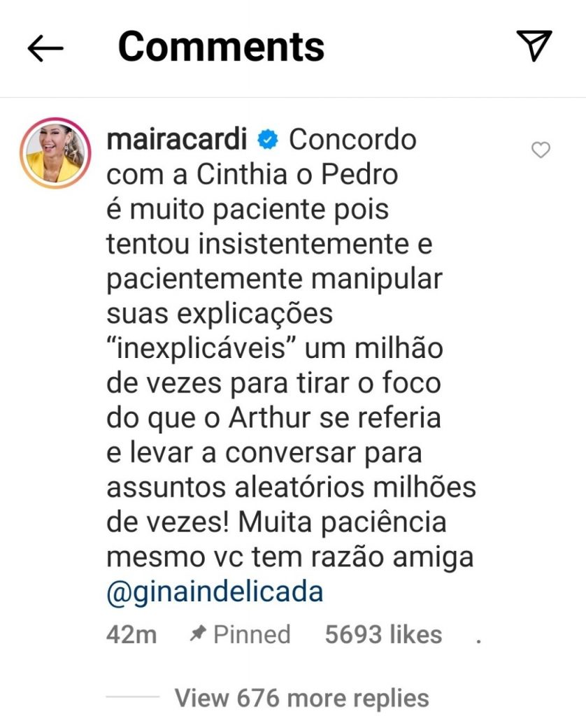 Mas Maira não parou, Cin! Ela comentou no perfil da Gina Indelicada, no Instagram, que concordava com ela e que Pedro era paciente sim, mas alfinetou: “Concordo com a Cintia. O Pedro é muito paciente, pois tentou insistentemente e pacientemente manipular suas explicações ‘inexplicáveis’ um milhão de vezes para tirar o foco do que o Arthur se referia e levar a conversa para assuntos aleatórios milhões de vezes! Muita paciência mesmo. Você tem razão, amiga”.