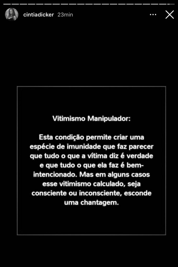 Em seguida, ela não parou e postou uma foto com os dizeres: “Vitimismo Manipulador: Esta condição permite criar uma espécie de imunidade que faz parecer que tudo o que a vítima diz é verdade e que tudo o que ela faz é bem-intencionado. Mas em alguns casos esse vitimismo calculado, seja consciente ou inconsciente, esconde uma chantagem”. VISH!