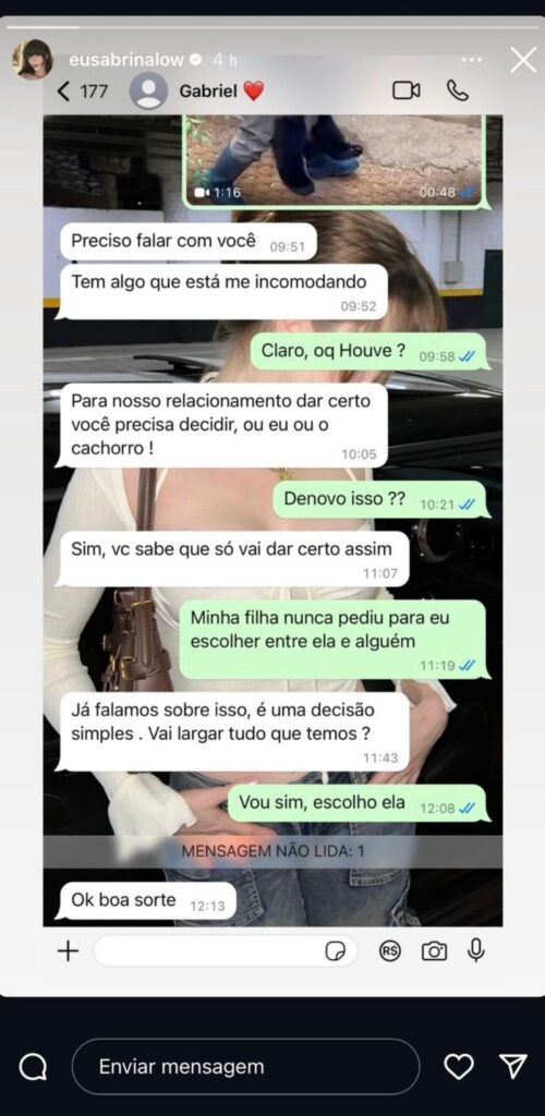 A influenciadora Sabrina Low, de 22 anos, provou que, quando o assunto é amor incondicional, ninguém supera seu cachorro. A influencer compartilhou uma mensagem de seu agora ex-namorado, exigindo que ela escolhesse entre ele e sua cachorrinha. “Escolhi a cachorra”, conta Sabrina.