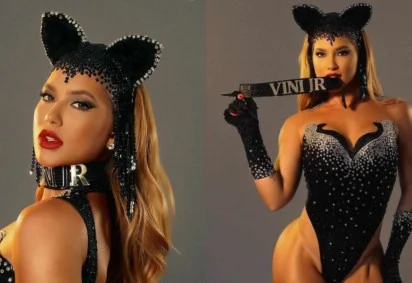 Corta para 2026. Entra Virginia Fonseca, rainha de bateria, empresária, máquina de engajamento e protagonista de um roteiro que faria qualquer autor de novela das nove pedir aumento. A fantasia reaparece, agora com body preto ultracavado, felino de laboratório fashion, ensaio feito na mansão de três andares do namorado e a coleira atualizada com o nome Vini Jr., o Neymar do imaginário global que não pisa mais em poça rasa.