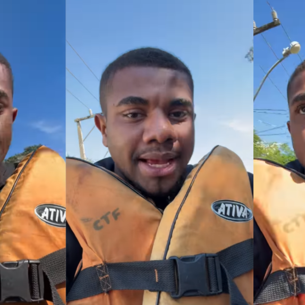 O baiano filmou um idoso que estava caminhando pela inundação e o questionou: “Como é que o senhor se sente neste momento, de ver tudo isso acontecendo [no RS]?”. O homem ficou em silêncio e não respondeu à pergunta.